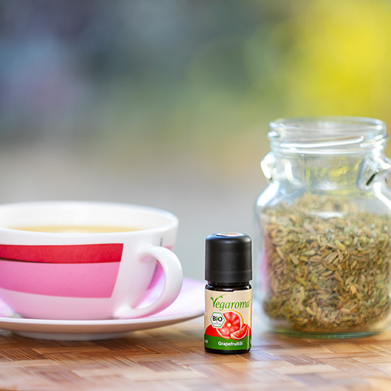 Das Grapefruitöl in ein Schraubglas tropfen und schwenken, bis das Glas rundherum benetzt ist. Den Tee dazugeben und gut durchschütteln und etwas durchziehen lassen. Anschließend den Tee wie gewohnt aufbrühen.