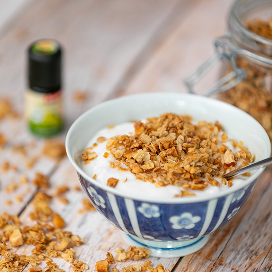 Das Kokosöl schmelzen. Den Ahornsirup, Salz und Vegaroma Bergamottenöl unterrühren. Anschließend die Haferflocken und die Nüsse dazugeben und gut durchrühren. Auf einem Backblech verteilen und ca. 15 Minuten bei 180°C im vorgeheizten Backofen backen. Zwischendurch einmal wenden.