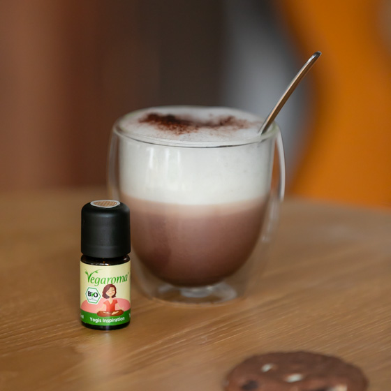 Das Kakaopulver mit etwas Wasser anrühren und den Yogi-Sirup untermischen. Die Milch oder Milchalternative aufschäumen und in die Mischung gießen.