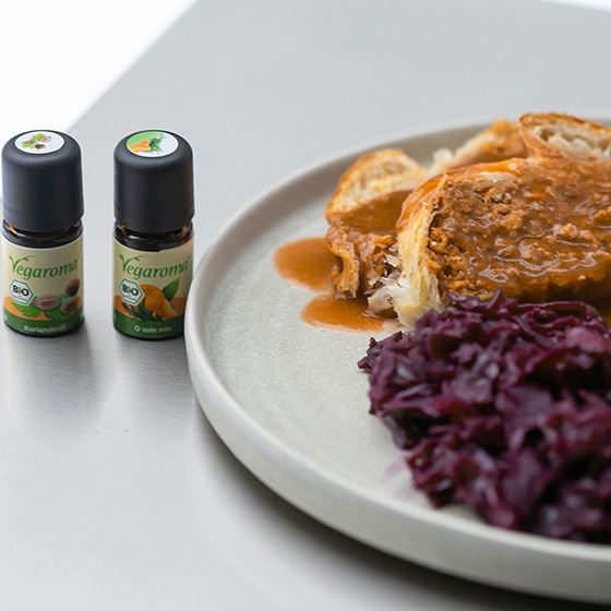 Linsenbraten mit Rotkohl und Bratensauce (vegan)